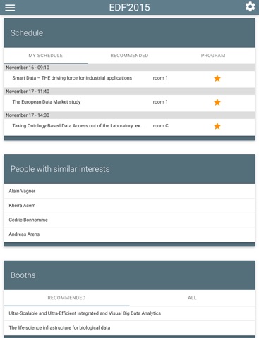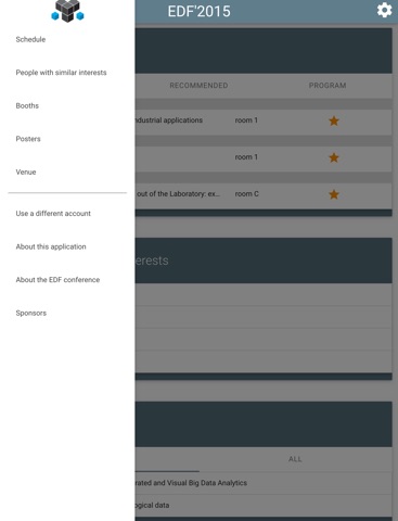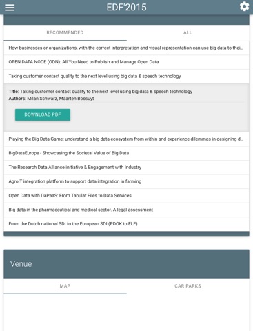 This application will provide you recommendations during the European Data Forum 2015 conference within a personalized interface, based on your profile. With this app, you can: