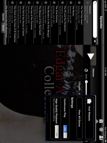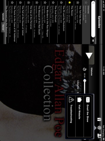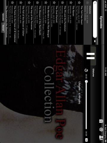 The Edgar Allan Poe Collection and App includes The Black Cat, The Facts in the Case of M. Valdemar, The Cask of Amontillado, The Fall of the House of Usher, Ligeia, A Descent into the Maelstrom, The Masque of the Red Death, The Murders in the Rue Morgue, The Oval Portrait, The Pit and the Pendulum, The Imp of the Perverse, The Tell-Tale Heart and selected poems. The collection is set up like a show with each story in the episodes section of the app.
