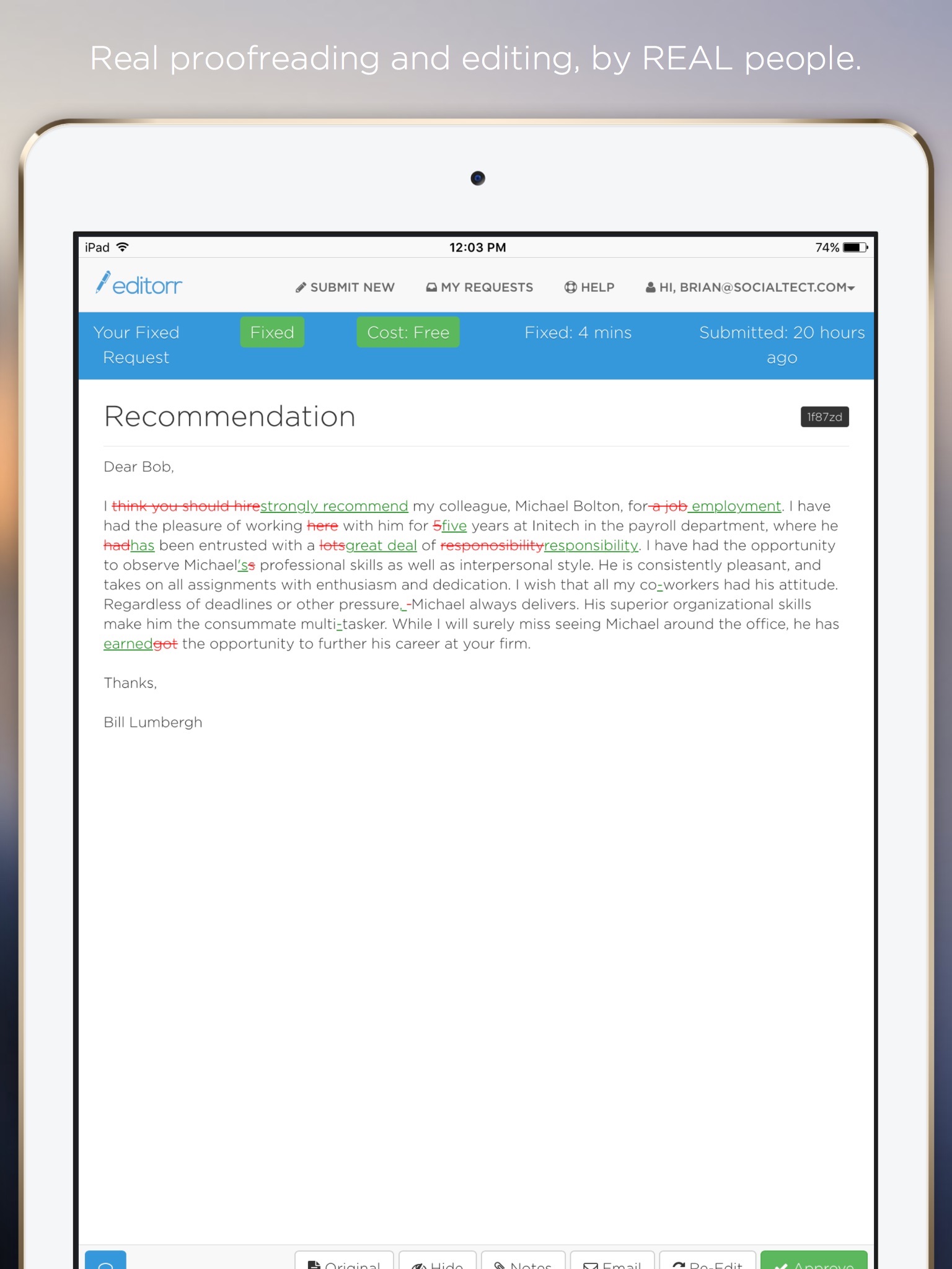 Although our app is a free download, editorr is not a free service. editorr uses real human beings to proofread and edit your written content, 24 hours a day, seven days a week, worldwide. We offer a variety of pricing options for your convenience. The more words you buy, the cheaper your cost is, per word