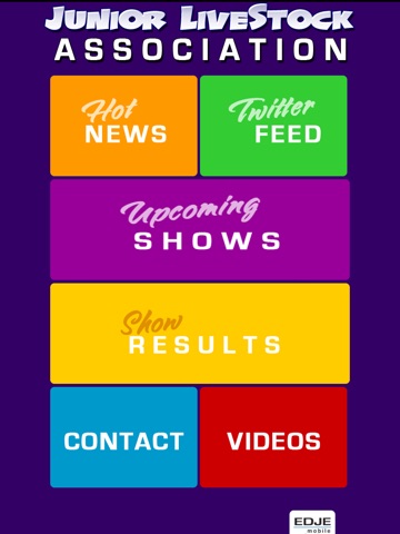 Junior Livestock Show Associations can now broadcast jackpot show results in real time using the new mobile app designed by EDJE. The mobile app can be customized for any Junior Livestock Association in North America. EDJE will customize and donate the mobile app to your organization. Call an EDJE representative to learn more. Features include a list of upcoming shows, show results, hot news, You Tube video feeds, show location mapping and contact information.