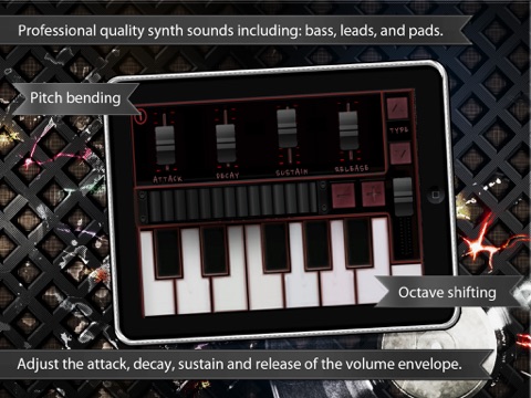 The keyboard provides rapid octave shifting and a pitch bending wheel. It also features adsr volume envelope adjusters, to alter the attack, decay, sustain and release of the synth.