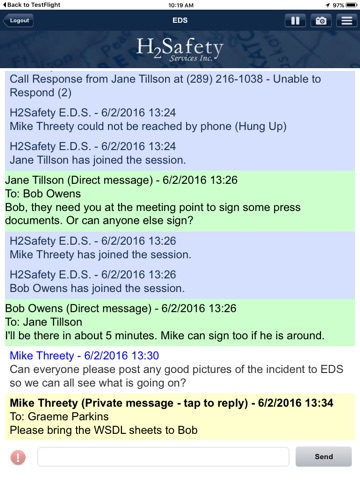 H2Safetys EDS allows all responders (internal or external if required) to easily record and organize all of their documentation and communications in one location. Messages can be broadcast both privately and publicly to specific groups and individuals using EDS. Attachments such as images and files can also be added for increased accuracy and efficiency.