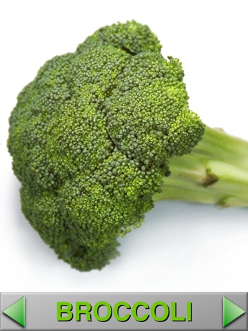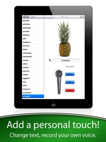 In portrait orientation, a food item and its name are shown. Touching the picture or text will play its diction. We can navigate through the items using arrows or simply by sliding the pictures with a finger like in the photos app.