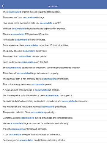 - Use a word in sentences: each word comes with a number of example sentences. Over 30000 sentences are added. This will help you to have better understanding of how a word is used in context.