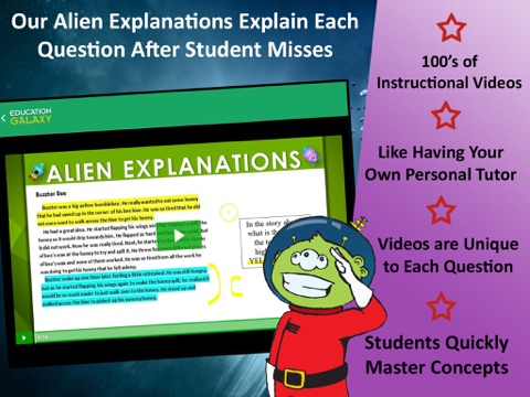 *Instructional Videos called "Alien Explanations" play after each missed question. Its like having a tutor over their shoulder assisting each time they need help.