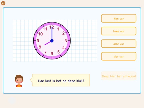 Ook de digitale klok kun je met deze app goed oefenen. Er zijn oefeningen voor de 12-uurs aanduiding, maar ook de 24-uurs aanduiding komt aan bod. Eerst leer je de klok lezen in uren, halve uren en kwartieren. Daarna leer je de klok per kwartier.