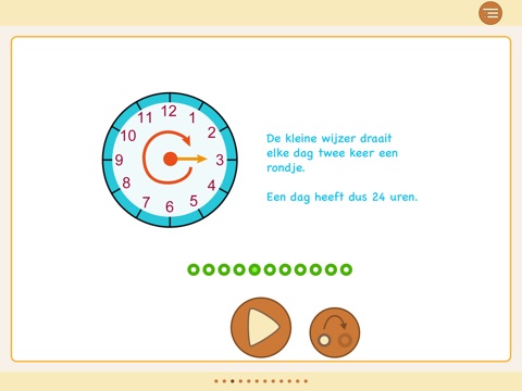 De ronde klok wordt in stapjes uitgelegd. Eerst hele uren dan halve uren en dan de kwartieren. Daarna leer je alles wat ertussen zit.
