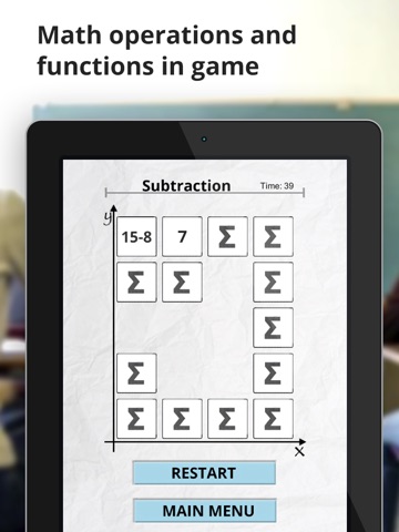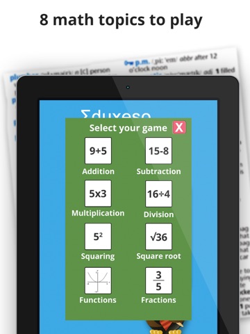 - 8 sets of games - Addition / Subtraction / Multiplication / Division / Squaring / Square root / Functions / Fractions