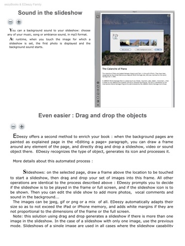 eezyBooks and EDeezy Family are made for books enriched with multimedia objects, such as slideshows enhanced with audio and vocal comments, video, music, windows open on the Internet… Now you can use your iPad, your iPhone or your iPod Touch to record your albums of memories. Your photos, your movies, your voice, your preferred music, your comments... are all integrated into multimedia books on the shelves of your eezyBooks library.