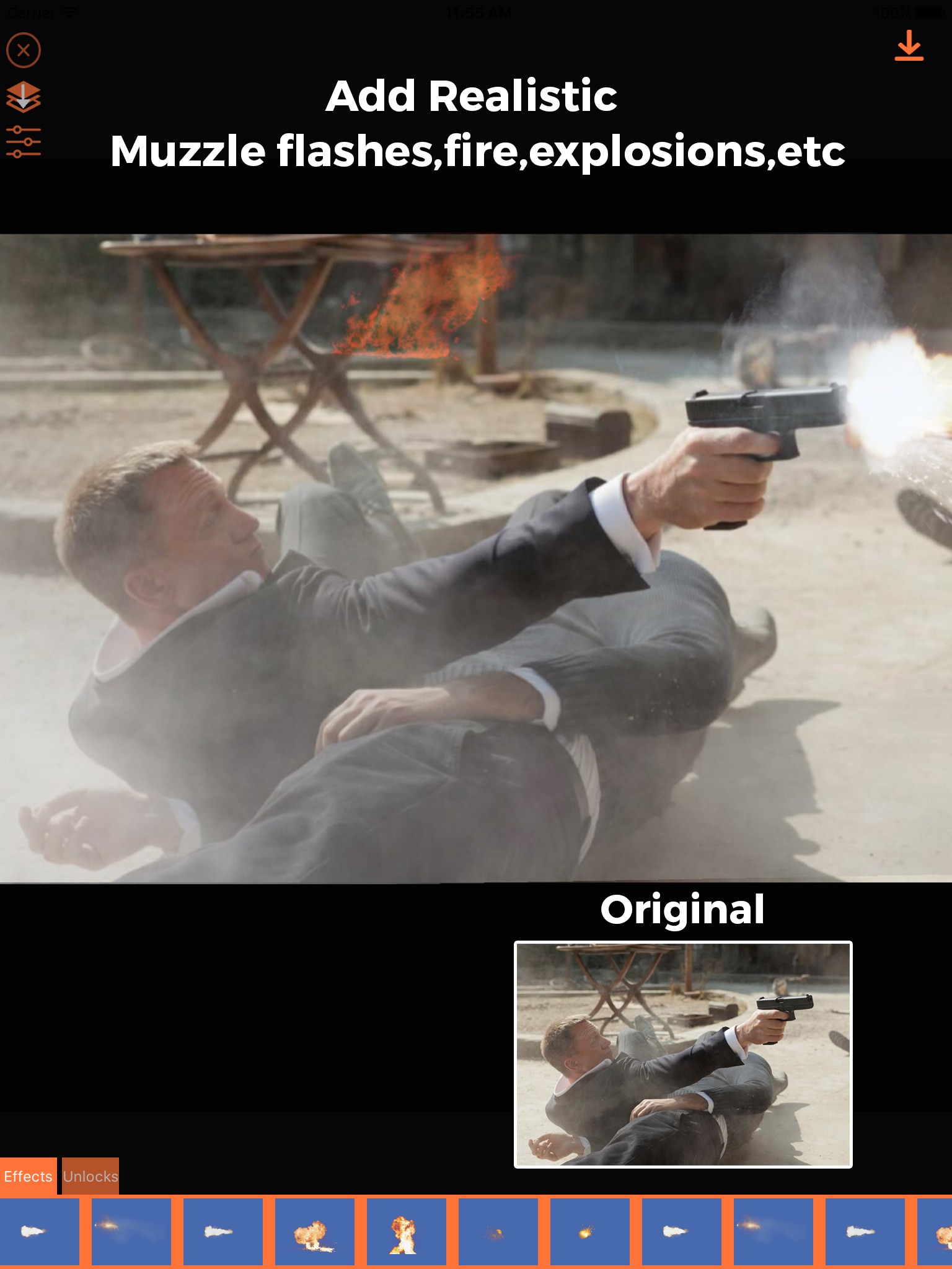 Create stunning visuals with realistic effects, fire,explosions,blast,muzzle flashes,blood its all there, create your action scene now!
