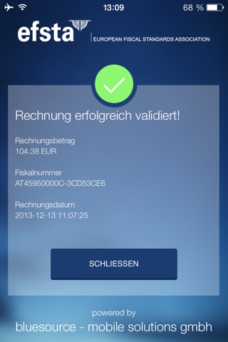Mit der kostenlosen EFSTA App können Sie ganz einfach EFSTA-signierte Kassenbons verifizieren. Zur Überprüfung scannen Sie den auf dem Beleg abgedruckten QR- bzw. Barcode ein oder tippen die Fiskalnummer (FN) samt Endbetrag manuell ein.