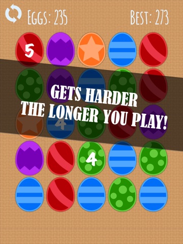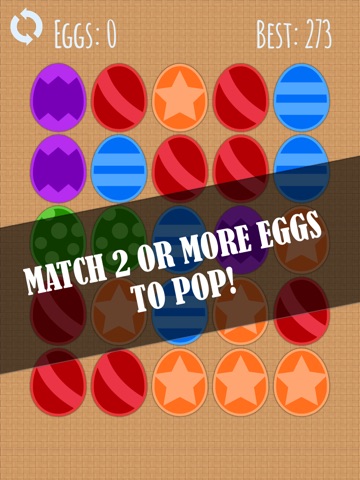 Players tap on groups of 2 or more adjacent matching eggs to collect them. New random eggs drop down so the board is always full.