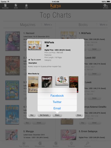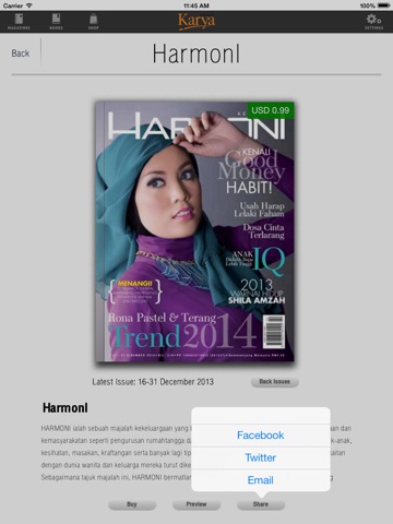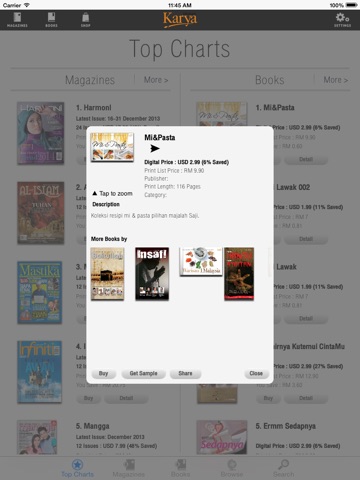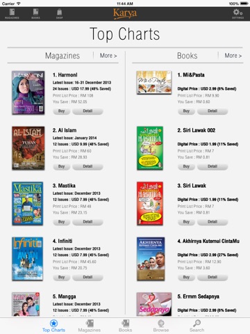 eKarya memperkenalkan semua tajuk majalah popular dari Utusan seperti Al Islam, Harmoni, Hijab Fesyen, i Sihat, Infiniti, Mastika, Saji, Urtv dan Wanita dengan langganan yang boleh diperbaharui secara automatik, langganan bermula dari 1 bulan, 6 bulan dan 1 tahun. Julat harga bermula dari hanya $ 0.99 hingga $ 7.99. Langganan ini secara automatik memperbaharui sendiri dan yuran perkhidmatan caj kepada kad kredit pelanggan yang didaftarkan dengan Apple ID mereka sekurang-kurangnya 24 jam sebelum mencapai kitaran tempoh langganan seterusnya.