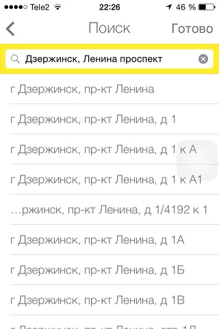 - Найти необходимый адрес в базе адресов города, используя подсказки