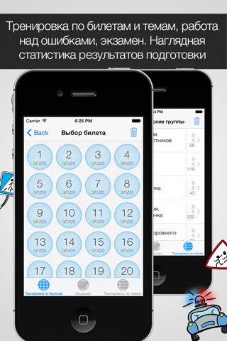 Режим «Экзамен» максимально приближен к условиям реального экзамена в ГИБДД, когда Вы ограничены во времени (20 минут) и максимально можете допустить 2 ошибки. Цветовая индикация билетов в режиме экзамена наглядно иллюстрирует Ваши успехи.