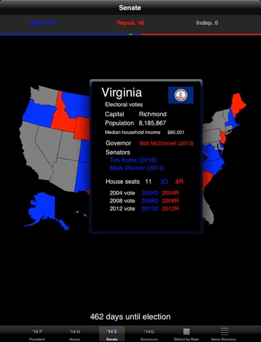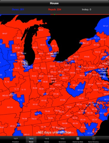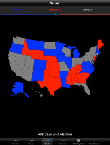 This app provides an interactive map that displays information related to the upcoming Presidential, US Senate and House of Representative Elections. Besides showing an electoral college map and the current balance of power in Congress, there is information on the 50 states and all 435 congressional districts.