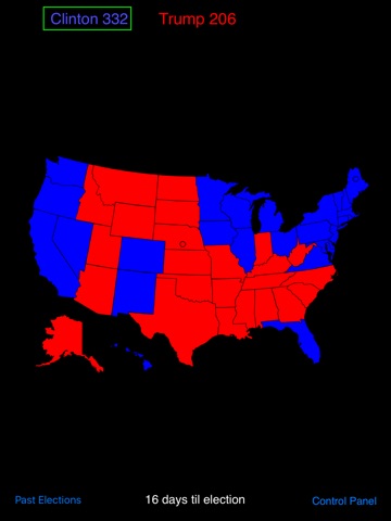 Quickly check possible 2016 election outcomes by changing states by touch from red to blue or vice versa and seeing the electoral college results. Zoom in on the map to make changes more easily. Two scenarios can be saved, or the map reverted to the 2012 results. Show friends what you hope (or fear) will happen.