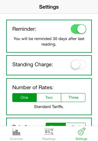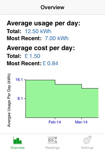 Enter your tariff details in the settings tab and once you have recorded two readings the overview data and graph will appear.