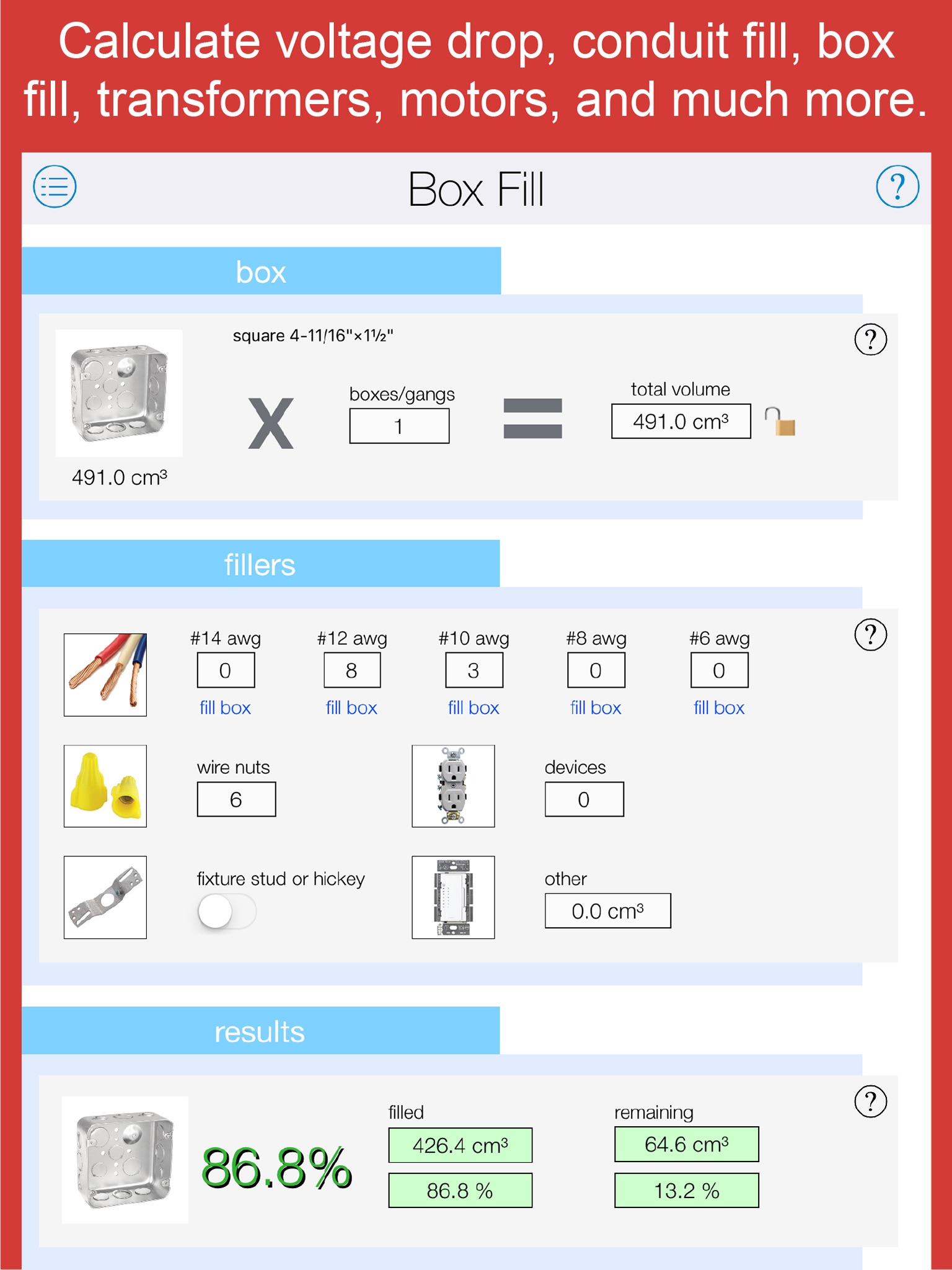 - Calculate any box fill situation in mL and cubic inch.