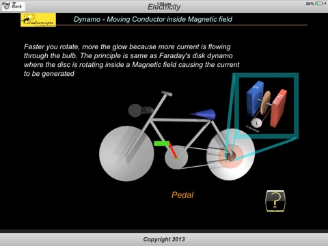 The simulations in this App are designed very carefully to simulate the real world scenarios and applications(The detailed coverage of simulations in this App is given below.). For ex, you can interactively learn the functioning of a cycle dynamo and how a simple rotation of cycle pedal can translate to a bulb glowing.