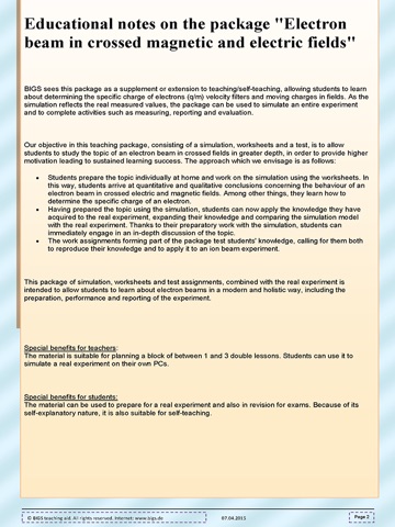 Together with the worksheets, the simulation guides users through to determining the specific charge (q/m) of an electron, including writing a report on the experiment. The assignments are intended to allow users to test the knowledge they have acquired.