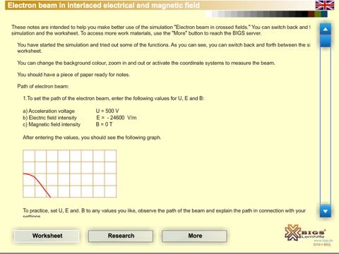 The simulation has been designed by BIGS as a self-explanatory program. However, user guidance is also available. Within the app, users can switch between the simulation and a worksheet intended to provide an even better understanding of the physics underlying the simulation. Users can also download additional work materials from the BIGS server using the "More" button. The materials developed by BIGS include work sheets and assignments. Thanks to the company Geogebra for special worksheets to explain cycloids.