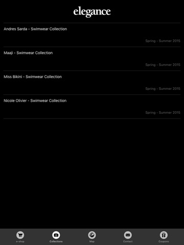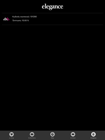 Με την εφαρμογή μας αυτή μπορείτε να δείτε τα επιλεγμένα προϊόντα του e-shop, να πλοηγηθείτε στη gallery φωτογραφιών της εταιρίας, να βρείτε όλα τα εταιρικά καταστήματα της Elegance στο χάρτη, και να αποκτήσετε εκπτωτικά κουπόνια για αγορές σας στο e-shop.