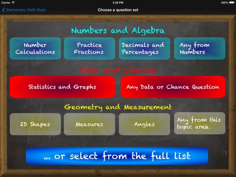 -choose questions based around topics (e.g. Numbers, Patterns, Data, Geometry, Measurement)