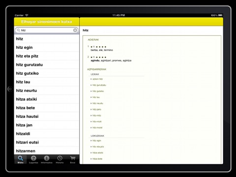 This is a dictionary of synonyms and antonyms. The Elhuyar Sinonimoen kutxa is a dictionary to help us find the right word whenever we want to expand our vocabulary. It is a useful tool for enriching our Basque and putting what is needed within reach of any user of Basque.