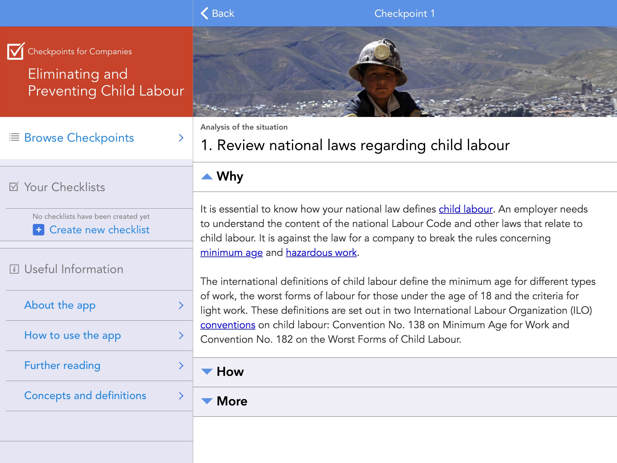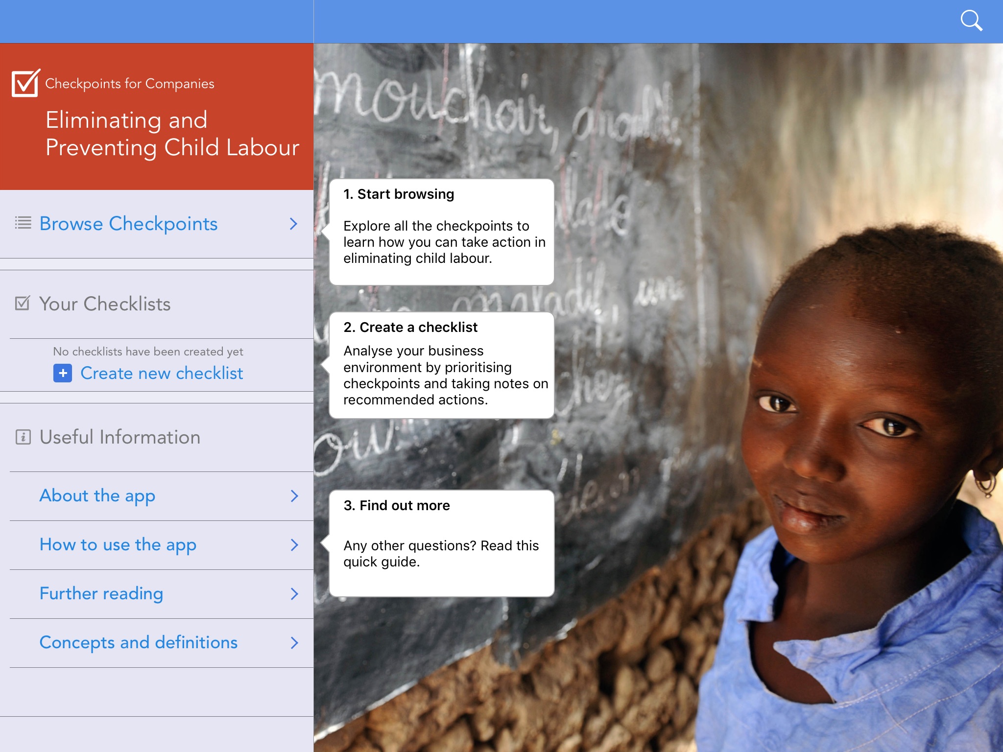 Eliminating and Preventing Child Labour - Checkpoints allows business managers and auditors to create interactive checklists that will help them ensure a child labour-free operation. There are 18 checkpoints in total. Each checkpoint provides best-practice recommendations for taking action.