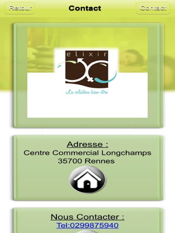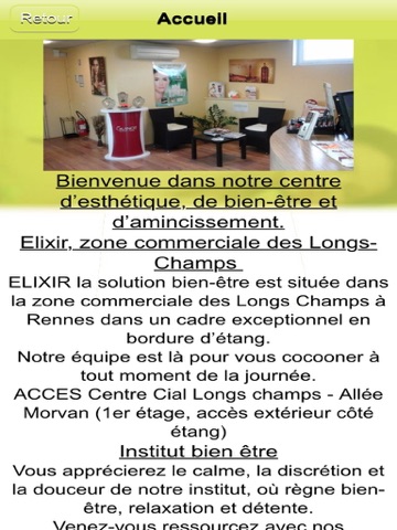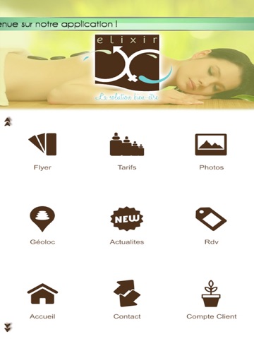 Lapplication Elixir bien etre vous offre la possibilité de consulter toutes les infos utiles de la boutique (Tarifs, prestations, avis…) mais aussi de recevoir leurs dernières News ou Flyers sous forme de notifications Push.