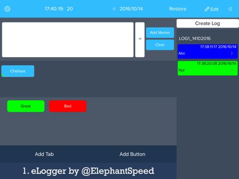 eLogger is free, the free version allows you to create two predefined tabs / buttons and has a 4 character limit of text that can be added to the log.