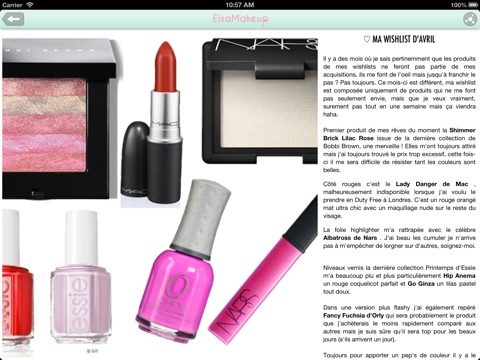 Découvrez toutes les dernières tendances en maquillage ainsi que des tests, des avis et commentaires rédigés par Elsa, jeune femme accro et spécialiste du monde du maquillage.
