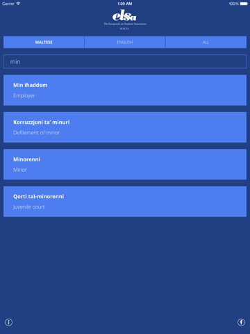 This app features the translation of legal terminology from Maltese to English, and vice versa; a convenient and practical tool for the Maltese law student and the only one of its kind for the local scenario. The proper use of jargon is indispensable in law studies and research - having this reference guide in your pocket will facilitate complex translations that you will inevitably come across and ensure your usage of correct language through instant results. The benefits of this app, which features automatic updates and push notification support, are yours to enjoy, free of charge.