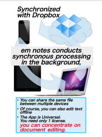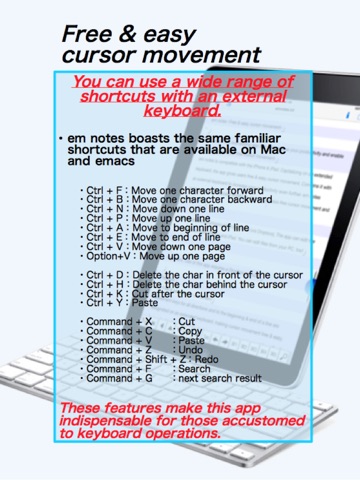 em notes is compatible with the iPhone & iPad. Capitalizing on an extended keyboard, the app gives users free & easy cursor movement. Combine it with an external keyboard to increase your productivity even further. em notes supports many keyboard shortcuts, providing stress-free cursor movement and text editing.