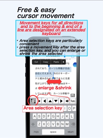 Movement keys for all directions and to the beginning & end of a line are designated on an extended keyboard, making cursor movement free & easy. Area selection keys are particularly convenient: press a movement key after the area selection key, and you can enlarge or shrink the area selected. Its just like pressing the arrow key while holding down the Shift key on a PC. You can control your cursor and area selection with extraordinary precision.