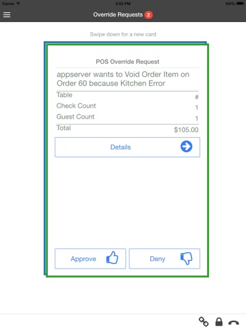 This mobile app allows restaurant owners / managers to remotely approve voids, comps, or discounts directly from their phone. Once you login to the app, youll be notified via push notification when an override is requested from the POS, allowing you to approve or deny the request. You can also see all the order details associated with each request.