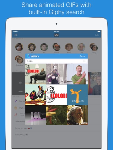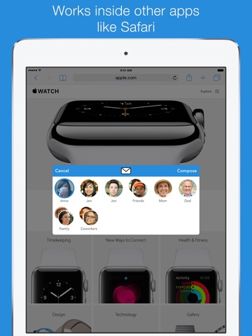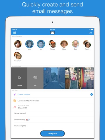 Email+ makes it easy to email the people you care about. You can mix and match contacts, groups, images, and text snippets to quickly compose messages. Just tap all the things you need, tap compose, and send. You can find and send funny GIFs right from the app. And with the share extension, you can use Email+ from inside other apps
