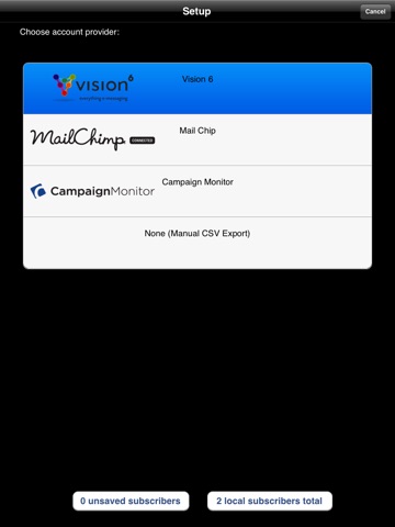After entering your providers details (depending on provider, usually just username and password), the app can be presented to potential customs to collect their name and email which will automatically be added to the chosen subscriber list. Please note the app doesnt import the contacts that are in your address book on your device.