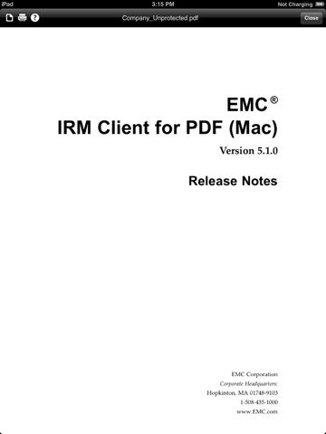 The EMC Documentum IRM mobile client allows iPhone, iPad and iPod users to view and print sensitive, protected documents while they are on the road. Documents are protected using high-security encryption and are easily accessed when users verify their identity with a central IRM server over a wireless connection. IRM-protected documents can be centrally managed either by document owners or by automated policies.