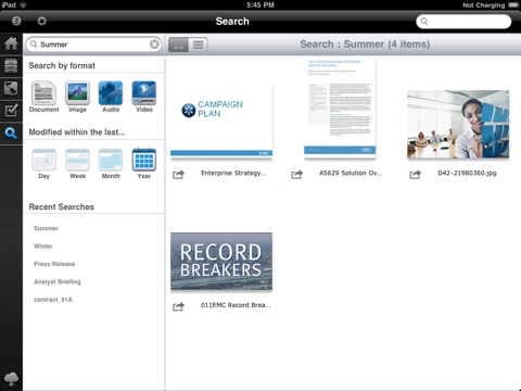 Getting the information you want, when you need it, has never been easier. EMC Documentum Mobile has a simple, intuitive interface, allowing users to access and securely browse the Documentum ECM repository, including rich media such as images and video, anytime from anywhere. You can easily perform common repository tasks such as search and preview, download content for offline access, engage in collaborative activities, and participate in business processes.