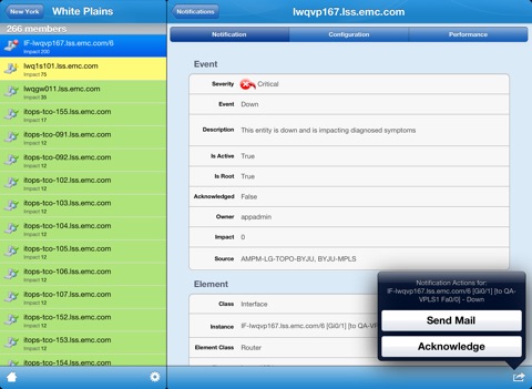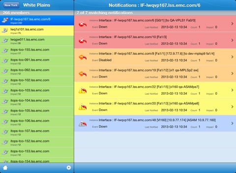 The EMC® Smarts® Mobile application is used to view and interact with a subset of the information that is available in the EMC® Smarts® Console. It is available on iPhone, iPod Touch, and iPad devices running iOS 5.0 and greater. An EMC® Smarts® console server version 9.2 is required. If an EMC® Network Configuration Manager® or an EMC® Watch4Net® server are configured then related data from these products can also be viewed in the EMC® Smarts® Mobile application. The application has two sections.