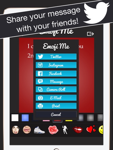 With Emoji Me, works great with all social media outlets. Share you custom made emojis on Facebook, Instagram, Twitter, Pinterest, Whatsapp, Linkedin or any other social networking site you use.