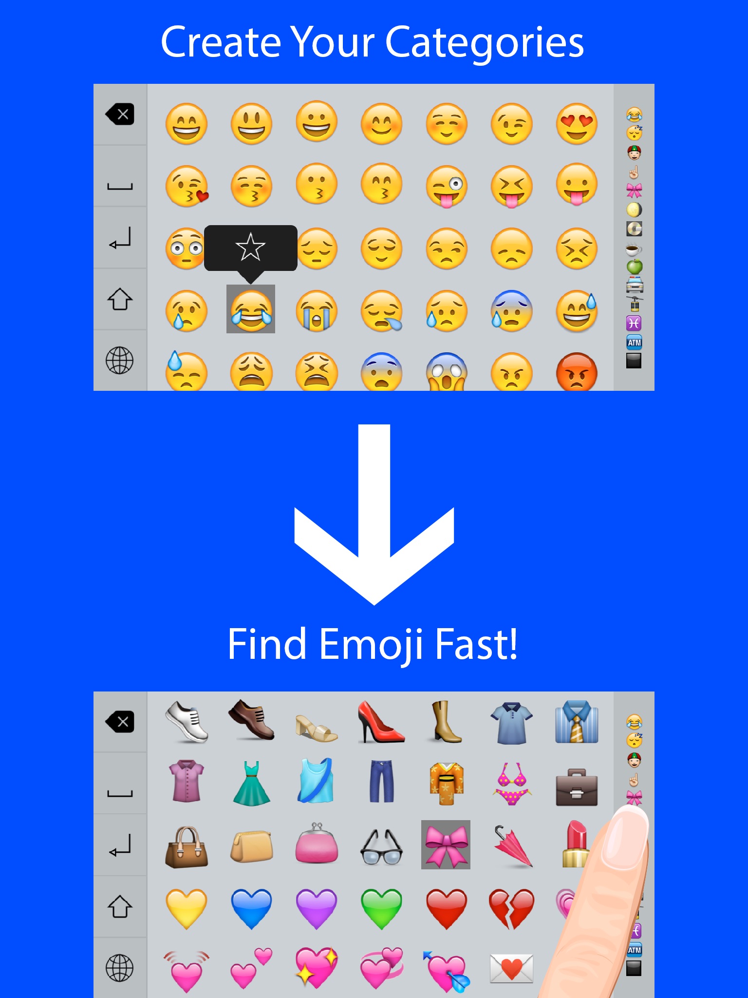 Emoji Monster is a highly customizable Emoji Keyboard that lets you create your own categories so that you can find your emojis fast.