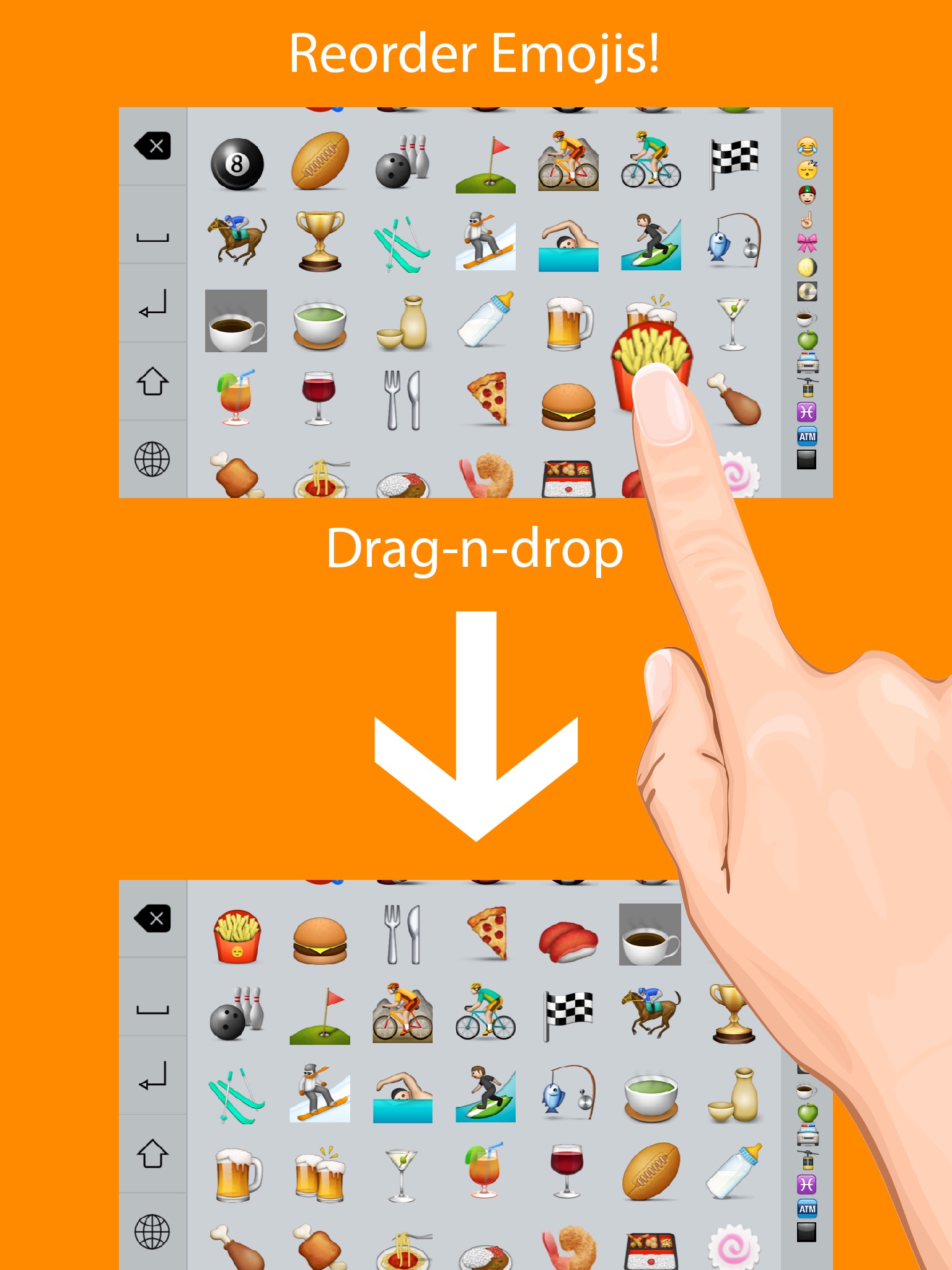 By simply swiping on the right side of the keyboard, you can access to your favorite emojis in no time.