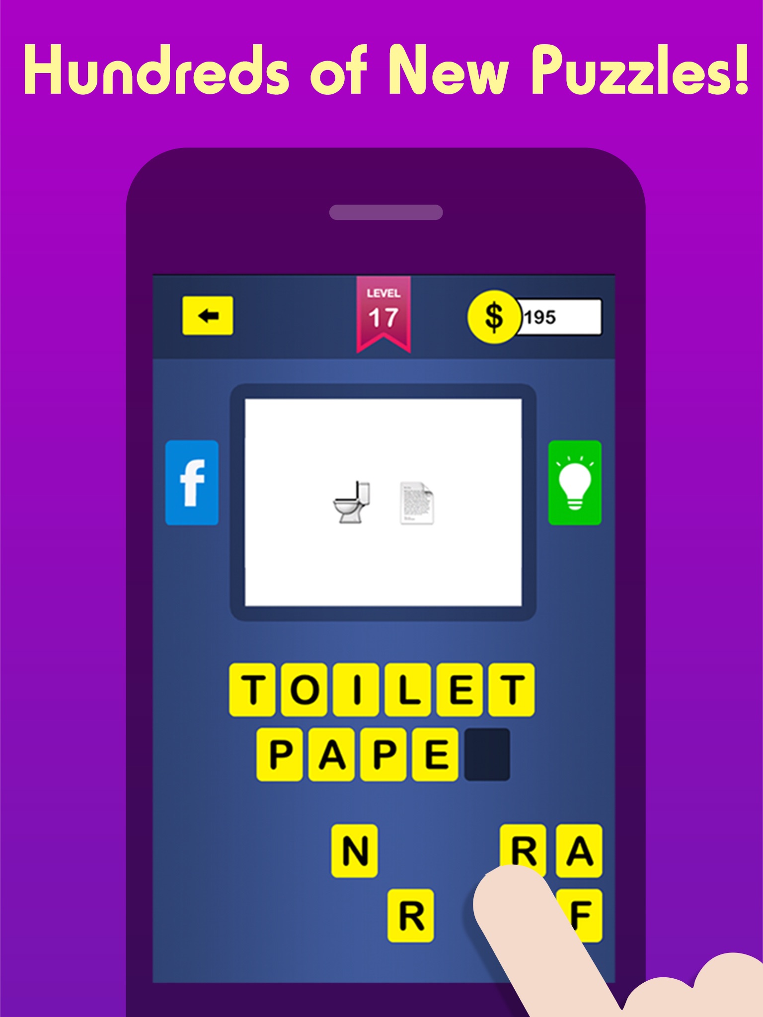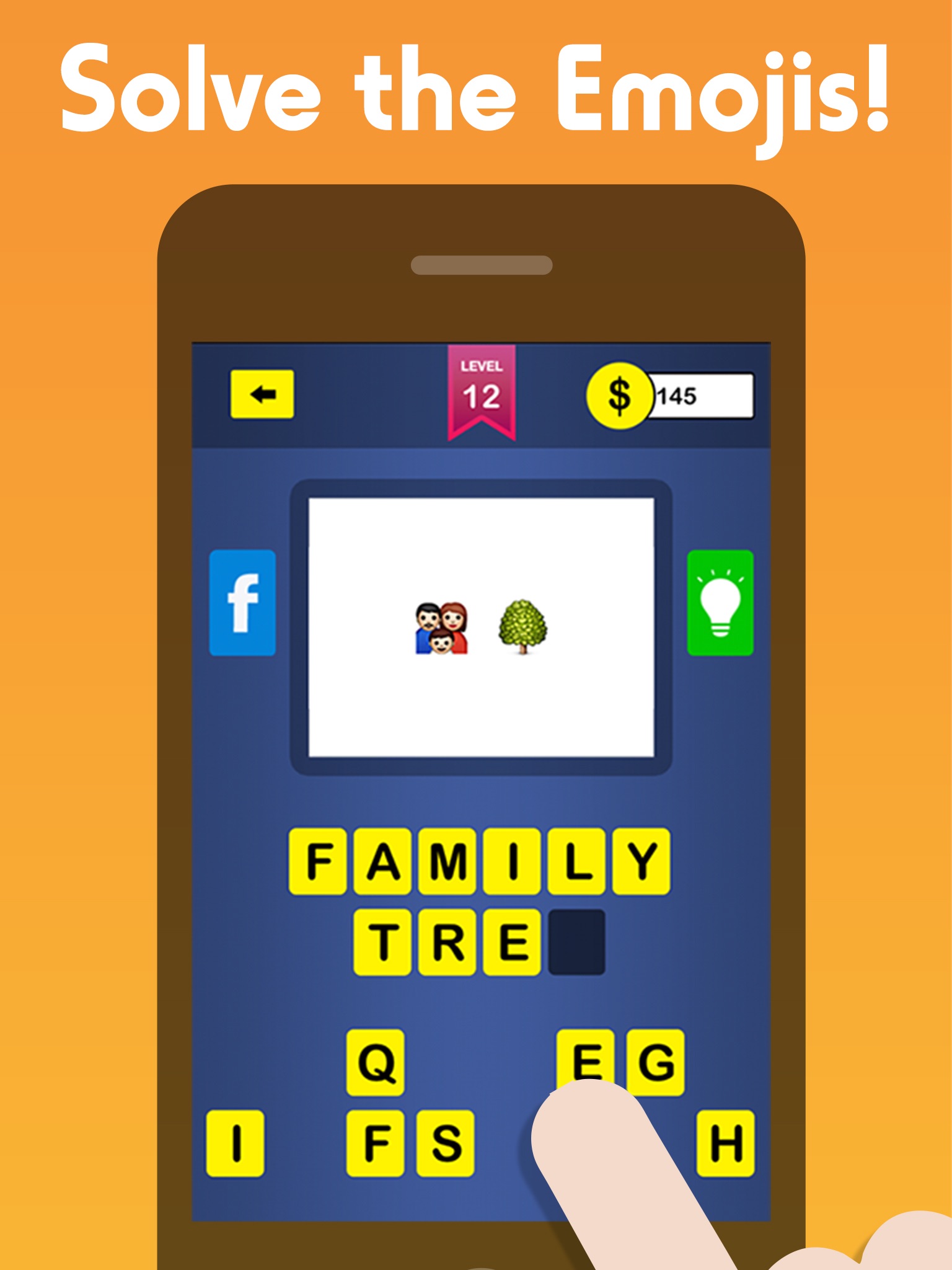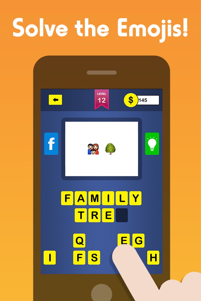 Includes hundreds of different Emoji puzzles to solve for free. If you get stuck, buy coins or even ask a friend on Facebook to help you guess the Emoji!