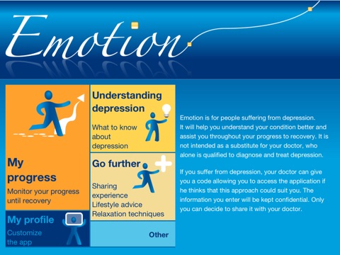 Emotion is not intended as a substitute for your doctor, who alone is qualified to diagnose and treat depression, but only to help you keep track of your progress and, if you wish, to share your results with your doctor.
