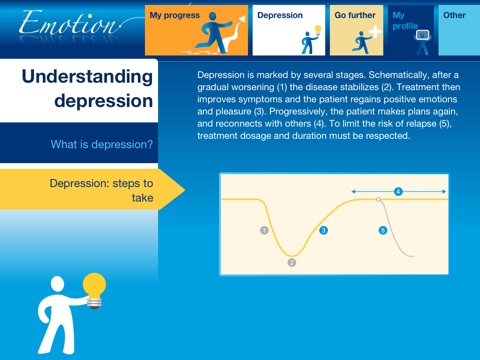 With this application, you have an easy-to-use tool to help you understand depression better and to assist you throughout your progress to recovery.