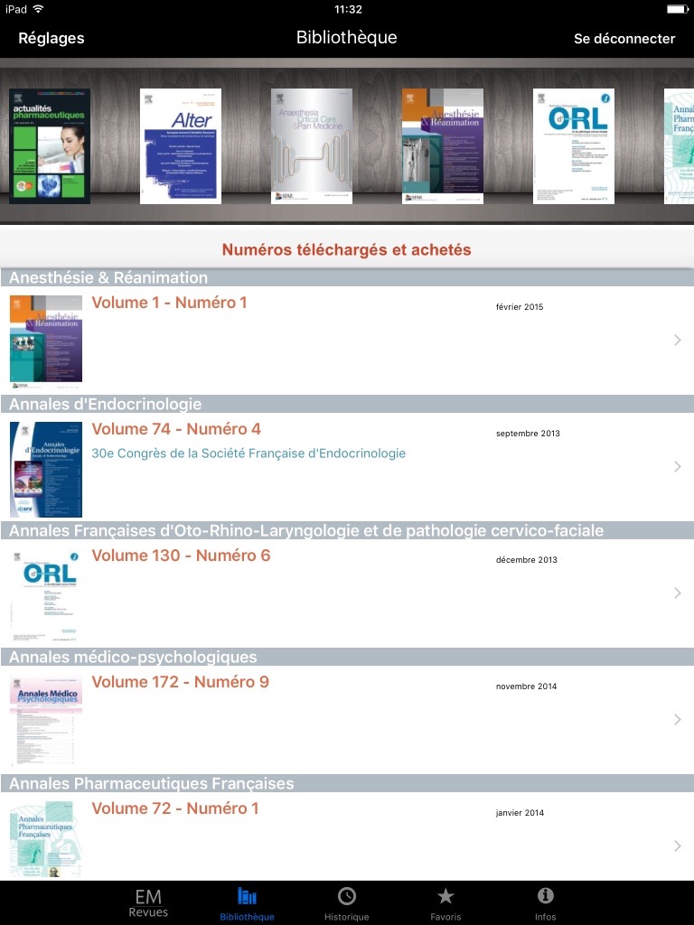 Les revues actuellement disponibles dans l’application iPad/iPhone : Annales de cardiologie et dangéiologie ; Annales de chirurgie plastique esthétique ; Annales de Dermatologie et de Vénéréologie ; Annales de Pathologie ; Annales dEndocrinologie ; Annales françaises danesthésie et de réanimation ; Annales Pharmaceutiques Françaises ; Annals of Physical and Rehabilitation Medicine ; Antibiotiques ; Archives de pédiatrie ; Archives of cardiovascular diseases ; Cancer / Radiothérapie ; Chirurgie de la main ; Diabetes & Metabolism ; Douleurs ; European Annals of Otorhinolaryngology, Head and Neck Diseases ; Gynécologie Obstétrique & Fertilité ; Joint Bone Spine ; Journal de Chirurgie Viscérale ; Journal de Gynécologie Obstétrique et Biologie de la Reproduction ; Journal de pédiatrie et de puériculture ; Journal Français dOphtalmologie ; La Presse Médicale ; La revue de médecine interne ; La revue Sage-femme ; Le praticien en anesthésie réanimation ; LEncéphale ; Médecine et Maladies Infectieuses ; Médecine Nucléaire ; Médecine palliative ; Néphrologie & Thérapeutique ; Neuropsychiatrie de lEnfance et de ladolescence ; Nutrition clinique et métabolisme ; Pratique neurologique – FMC ; Progrès en Urologie ; Progrès en urologie-FMC ; Revue de Chirurgie Orthopédique et Traumatologique ; Revue dEpidémiologie et de Santé Publique ; Revue du rhumatisme ; Revue Française dAllergologie ; Revue Neurologique ; Science & Sports ; Sexologies.