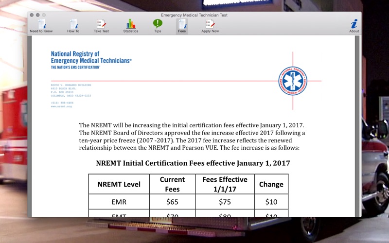 - “Fees” section showing exam fees for 2007-2017, as well as the fee increase after 2017 for all NREMT levels